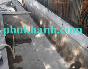 Hiện trạng bể nước dùng để nuôi cá kiểng trước công ty với diện tích hơn 200 m2. Thành bể nước được xây bằng gạch và chưa thi công chống thấm nên gây ra thấm nghiêm trọng. Cần thi công chống thấm bằng vật liệu chuyên dụng để ngăn nước thấm ra bên ngoài và đảm bảo môi trường nước để cá có thể sống.