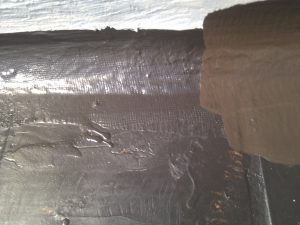 – Thi công lớp phủ thứ nhất: Tiến hành thi công lớp phủ thứ nhất với định mức khoảng: 0.6 kg/m2. Đồng thời tiến hành phủ lớp lưới thủy tinh tại các vị trí góc cạnh chân tường để ngăn hiện tượng rách màn chống thấm khi xảy ra co ngót bề mặt.