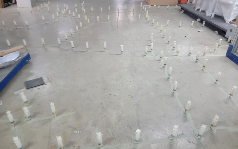 Tiến hành thi công vá các vết nứt, lấp đầy các lỗ hổng trên bề mặt sàn bằng vật liệu chuyên dụng.