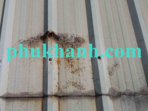 – Hiện trạng mái tôn bị rỉ sét và mục tại vị trí tiếp giáp ngang sóng tôn. Theo thời gian sử dụng nhiều vị trí đinh vít bị bung gây ra dột mái tôn. Tại các vị trí tiép giáp dọc sóng tôn bị dột nước mưa khi trời mưa có gió lớn. Dột nước mưa tại vị trí tôn sáng, vị trí có độ hở lớn so với bề mặt mái tôn.